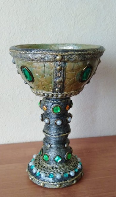 Материалы: пластиковая бутылка, джутовый шнур, сухой горох, яичная скорлупа, салфетки, стразы, металлическая крышка от стеклянной банки, картонная втулка, акриловые краски, акриловый лак, клей ПВА, полимерный клей.