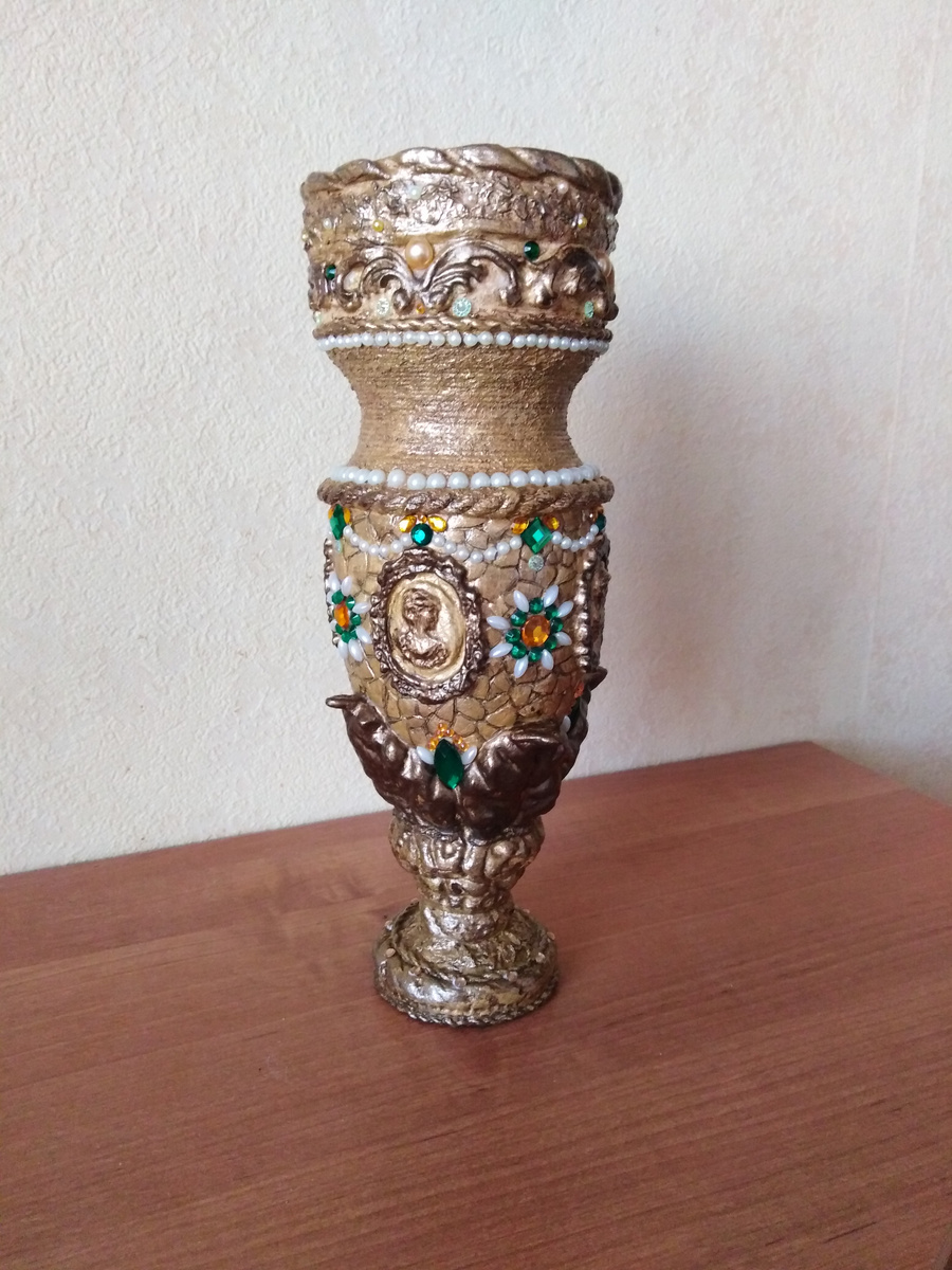 Материалы: пластиковая бутылка, джутовый шнур, сухой горох, стразы, салфетки, солёное тесто, металлическая крышка от стеклянной бутылки, картонная втулка, акриловые краски, акриловый лак, клей ПВА, полимерный клей.