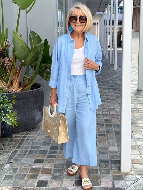 - Легкий деним. Чтобы ощущать свежесть жарким летом, дамам за 60 обязательно нужно обращать внимание на одежду светлую и легкую. Хорошим выбором в жару станет тонкий деним – свободные широкие брюки и просторная рубашка. Топ под рубашку и устойчивые сандалии на плоском ходу – и зной не страшен.