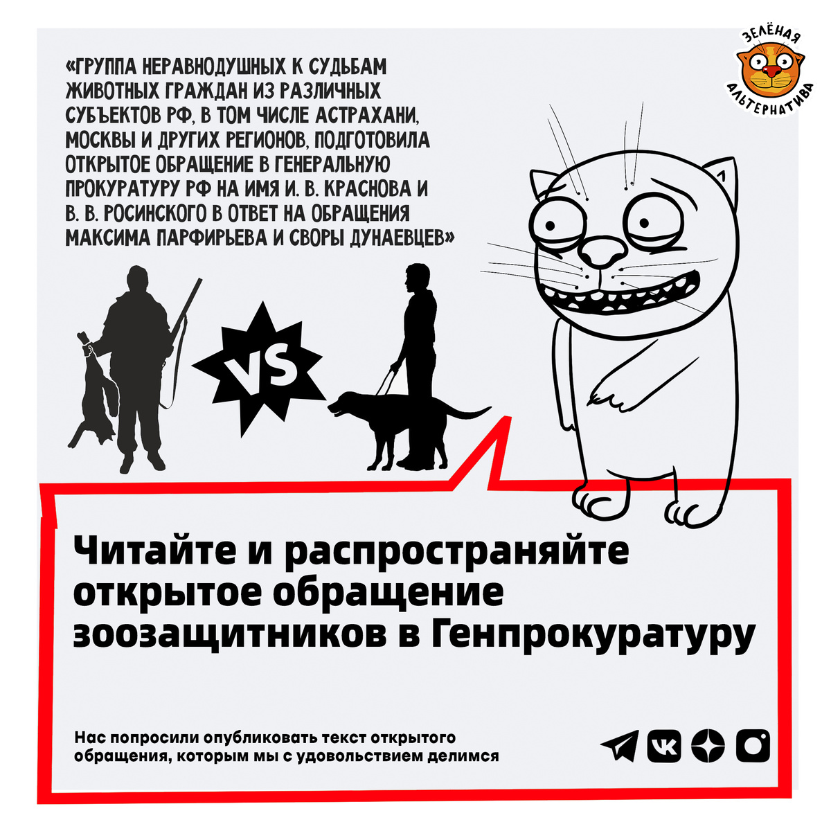 Нас попросили опубликовать текст открытого обращения, которым мы с удовольствием делимся. Переходите по ссылке и изучайте позицию зоозащитников России. Делитесь данным материалом, чтобы как можно больше людей узнали гуманные факты и умели объяснить несведущим друзьям и близким правду.