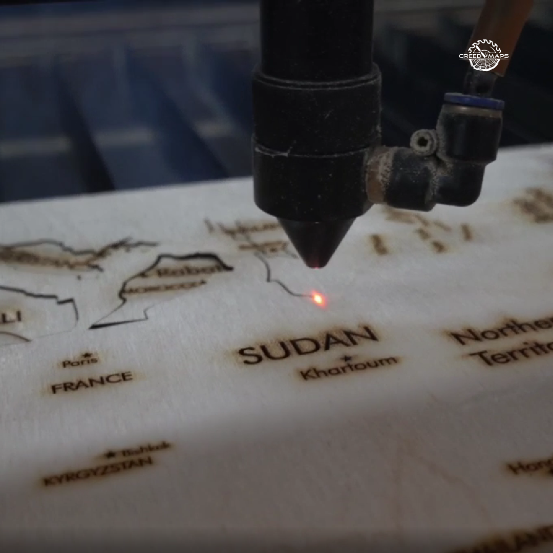 Создание интерьерной карты в CreedMaps превратилось в целую технологию. Все для того, чтобы ваша покупка радовала и удивляла вас каждой деталью ❤️ Мы не используем фотопечать — каждый элемент карты выгравирован лазерным станком. На карте хорошо видны даже самые мелкие название рек и озер. Благодаря этому наши карты сравнивают с географическими атласами, потому что все элементы выгравированы в натуральный географический вид. Имеются даже маленькие острова, такие как: Сицилия, Кипр, Крит и др. После гравировки деталей, карты шлифуются от самого мелкого до самого крупного фрагмента. Так мы убираем все неровности и готовим карту к следующему этапу. Мы не используем краску. Детали пропитываются премиальным итальянским маслом, что позволяет сохранять дерево в первоначальном состоянии долгие годы. Карта не выцветает и устойчива даже к прямым солнечным лучам. Фрагменты разной толщины склеиваются, и карта превращается в рельефное полотно. Затем мы проверяем карту на правильную стыковку деталей.