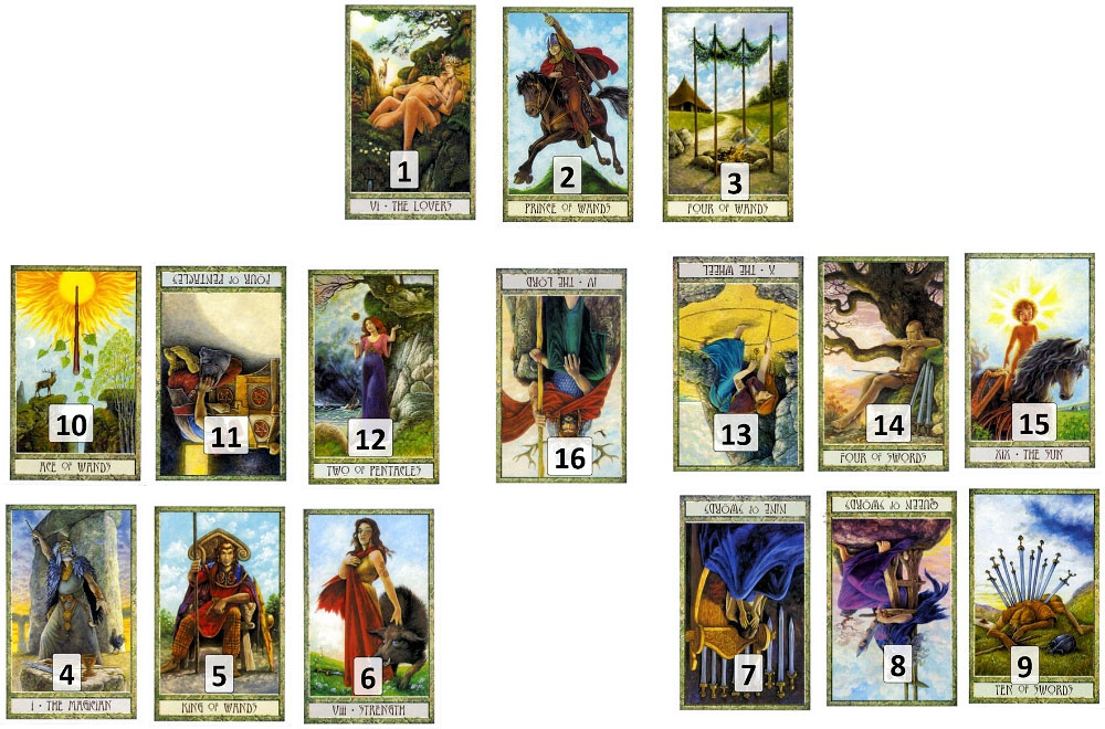 Итак, расклад делался на месяц. Карты выкладывались по следующей схеме: В прошлом у моего знакомого все складывалось очень хорошо: удачная женитьба (Влюбленные), переезд (Рыцарь Жезлов) в новый дом (Четверка Жезлов). Моральное и материальное равновесие, душевная гармония (Четверка Жезлов).