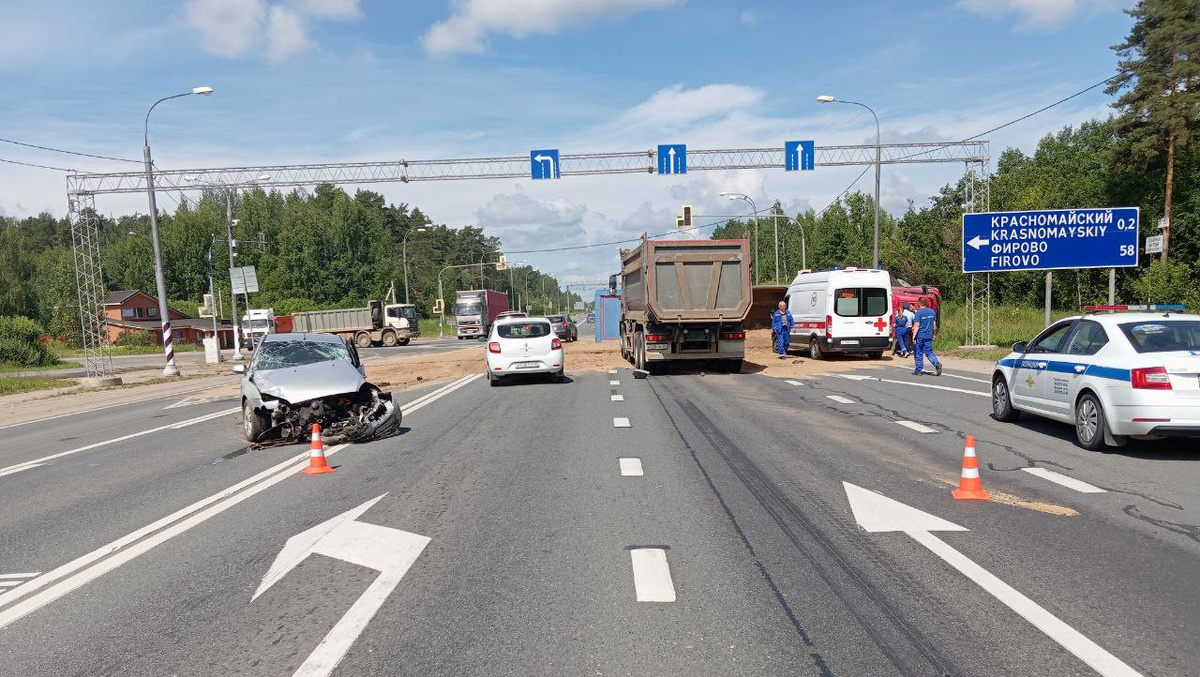 На М-10 после ДТП перевернулась фура с песком: водители получили тяжёлые травмы