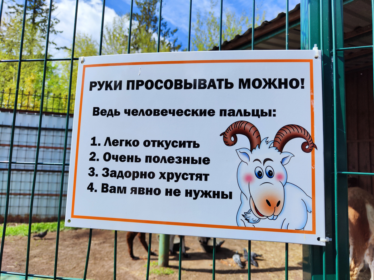 Смотрите какая прелесть :))) Эта прелесть висит в Ижевске, в зоопарке. Красивый, крупный зоопарк, где животные живут не в клетках, а в вольерах. Пусть и не больших, но все-таки. А вольерная решетка позволяет людям подходить максимально близко. Ну и как, скажите на милость, уберечь животных от приставучих людей? По-моему, посетители засматривались на эту табличку больше, чем на самих козликов за ней