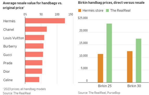 Hermès в январе поднял цены на свои сумки Birkins из экзотической кожи примерно на 20%. Реселлеры считают, что шаг был направлен на сокращение прибылей на рынке подержанных вещей, но это не сработало. На левом графике видно, что сумки от Hermes на "вторичном рынке" дороже в среднем на 30% первоначальной цены. По всем остальным сумкам дисконт ~50%. тг канал https://t.me/TradPhronesis
