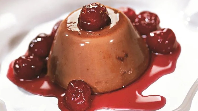 ИНГРЕДИЕНТЫ НА 6 ПОРЦИЙ Шаг 1 Влить молоко в сотейник, всыпать желатин и дать постоять 5 мин. Затем тщательно размешать. Шаг 2 Шоколад натереть на крупной терке. Шаг 3 Сливки смешать с сахаром (0,5 стакана) и довести до кипения. Снять с огня. Добавить шоколад, перемешать до однородности. Шаг 4 Влить теплые сливки с шоколадом в смесь молока и желатина. Тщательно перемешать. Шаг 5 Разлить по формочкам, накрыть и поставить в холодильник минимум на 12 ч. Шаг 6 Вишни вымыть, удалить косточки. Смешать вишни с портвейном, сахаром (0,5 стакана) и уксусом. Поставить на огонь и довести до кипения. Уменьшить огонь до среднего и готовить 15 мин. Снять с огня и дать остыть до комнатной температуры. Опустить на 2 мин. формочки с панакоттой в поддон с теплой водой, перевернуть на порционные тарелки. Подавать с вишневым соусом.