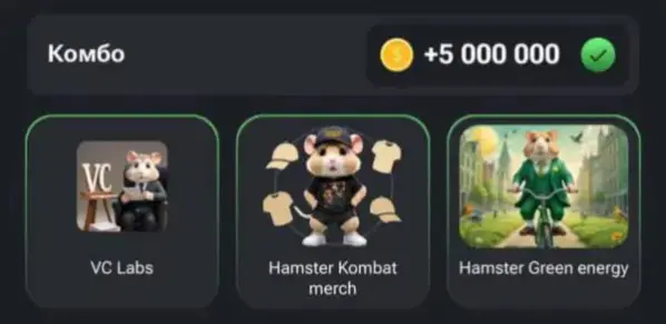 Комбо в Хамстере на 24 - 25 июня Хамстер Комбат – это не просто развлечение, это шанс окунуться в мир криптовалют без рисков и начать зарабатывать реальные деньги, развивая свои стратегические навыки. Присоединяйтесь к игре, прокачивайте своего хомяка и начинайте новую главу в мире цифровой экономики! Эти бонусы помогают быстрее развивать хомяка и увеличивать пассивный доход. Чем лучше карты, тем больше монет зарабатывается автоматически, что снижает необходимость постоянного кликанья. Комбо-карты стимулируют игроков чаще заходить в игру и покупать новые карты. В