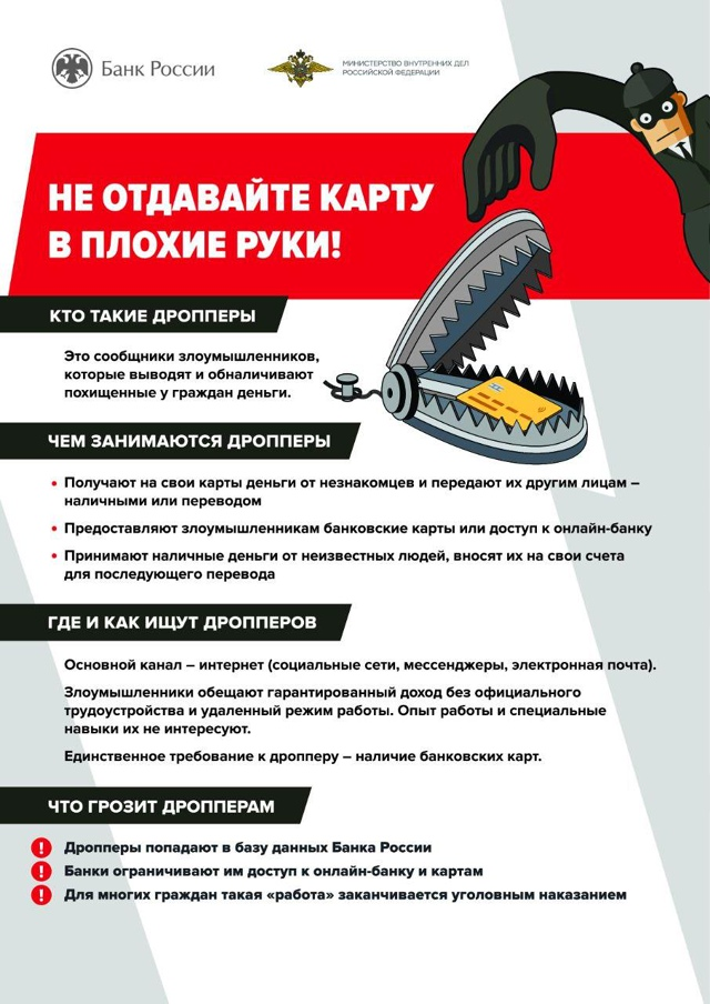 Дропперы или дропы – сообщники мошенников. Они выводят и обналичивают деньги, похищенные у людей. Дропы получают на свои карты деньги от незнакомцев и передают их другим лицам – наличными или переводом.