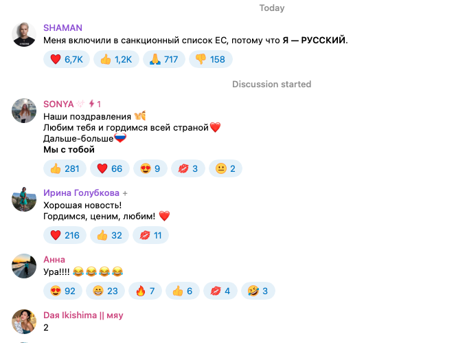 «Меня включили в санкционный список ЕС, потому что Я – Русский» — опубликовал на свой странице в ТГ -певец SHAMAN, узнав о включении собственной персоны в очередной санкционный список ЕС. Русскоязычные комментаторы начали поздравлять певца с таким мировым признанием его заслуг о области любви к Родине. "Это еще раз подтверждает, что твои песни достигают сердца людей во всем мире, а они боятся этого твоего влияния!" - писали поклонники творчества певца. Помимо Шамана в новый европейски список попали певица Полина Гагарина, актер Иван Охлобыстин, лагерь "Артек" и гендиректор холдинга "Нью Медия" (газета "Жизнь", "SHOT", "Мэш" и тп) Арам Габрелянов.