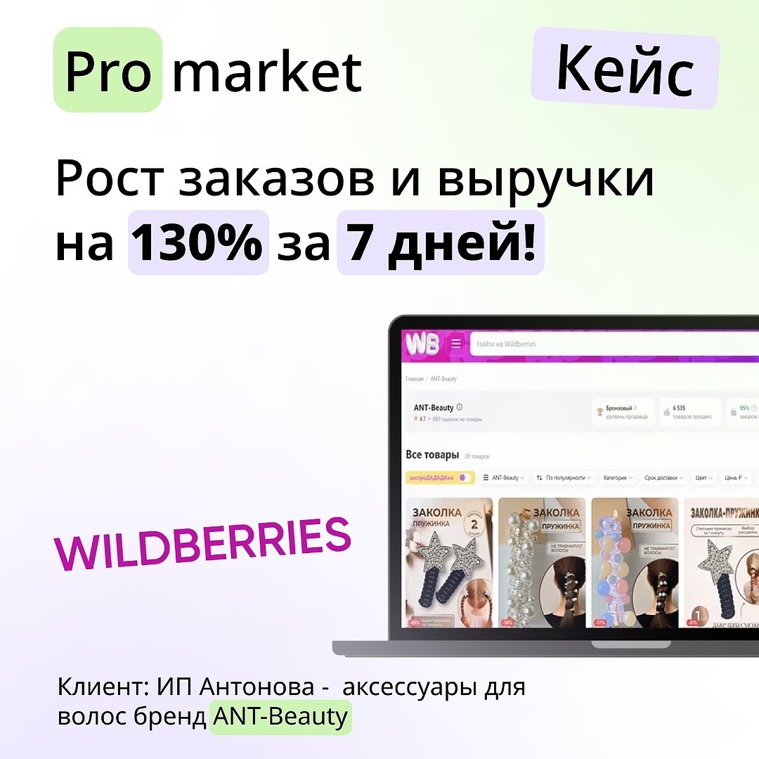 3 После проработки карточка попала в новые категории и увеличилось количество ключевых запросов до 1544. 4 Далее была запущена внутренняя реклама с проработкой минус фраз. 5 После проведение всех работ с карточкой за 7 дней мы увеличили заказы в 2 раза и выручку на 130%. Итоги продвижения: