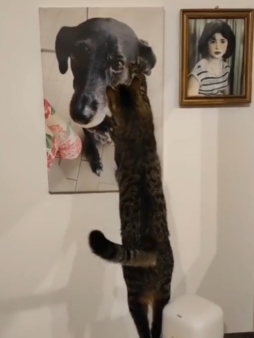 Как же кошки умеют любить и привязываться к тому, с кем они живут, пусть и не очень долго. Причем самые теплые чувства мурлыки могут испытывать и к людям, и к сородичам, и к другим животным. И порой таким искренним отношениям могут поучиться у домашних питомцев даже некоторые люди. История про котенка Грута собаку по имени Клео из Италии запала в душу многим пользователям сети. Ролик, где котик гладит лапкой большой портрет черной собаки, просто невозможно смотреть без слез. Маленький мурлыка не так давно появился в итальянской семье, где уже жила взрослая собака. Кроха не растерялся и сразу же подружился с Клео, сделав ее своим самым лучшим другом. Та сначала настороженно отнеслась к новому жильцу, но потом привыкла и даже была не прочь проводить с ним время. Клео и Грут вместе играли, ели и спали. Словом они стали самыми настоящими друзьями. Идиллия продолжались почти год. Однако через девять месяцев собака серьезно заболела. К сожалению чуда не случилось, и спустя неделю Клео н