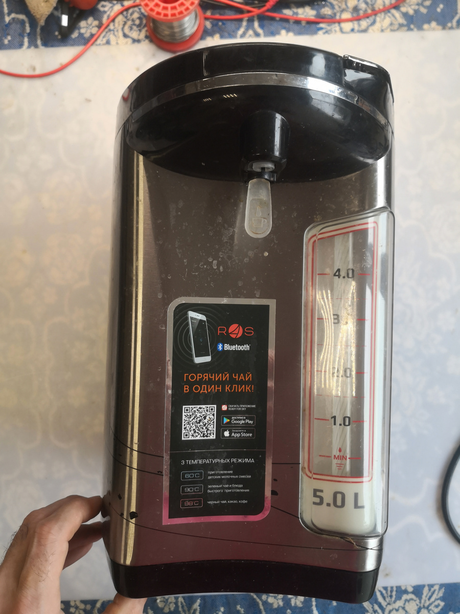 Всем здравствуйте! Сегодня у нас на ремонте термопот Redmond rtp-m810s с диагнозом не включается. По факту так и есть. При подключении к сети нет никаких признаков работоспособности. Вот такой чайничек. Будем разбирать и посмотреть. Снимем крышку.... А под ней и нету толком ничего. Но это так кажется. Сначала я думал халява пришла. Решил проверить термопредохранитель. Прибор в руки и .... Облом. Хорошо, лезем дальше. Чем мне понравилась эта модель, так это тем что вся "мошонка" вылезает вместе колбой. Нет разных соединительных шлейфов и прочей неудобной лабуды, как встречается в других фирмах. А тут всё просто. И вот он блок питания. На первый взгляд неисправность очевидна. Вздулся литик. И вот тут я вспомнил, у меня была точно такая же плата в ремонте и тогда я потерпел фиаско. Вот та статья. И главное с шим тогда я угадал. Здесь установлен MD12H. Но это уже дела давно минувших дней. А у нас после замены этого электролита термопот стал циклически перезагружаться. Я сначала подумал ч