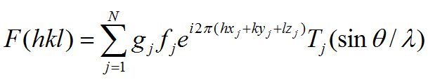 где h, k и l – координаты дифракционного отражения, суммирование (S) идет по всем N атомов в элементарной ячейке, gj – заселённость позиции (доля занятых j-ым атомом элементарных ячеек), fj – рассеивающая способность j-го атома (табулирована), xj, yj и zj – его координаты в элементарной ячейке, Tj(sin(тета)/лямбда) – параметр атомного смещения, о котором я расскажу позже. Это первая из двух основных формул РСА.