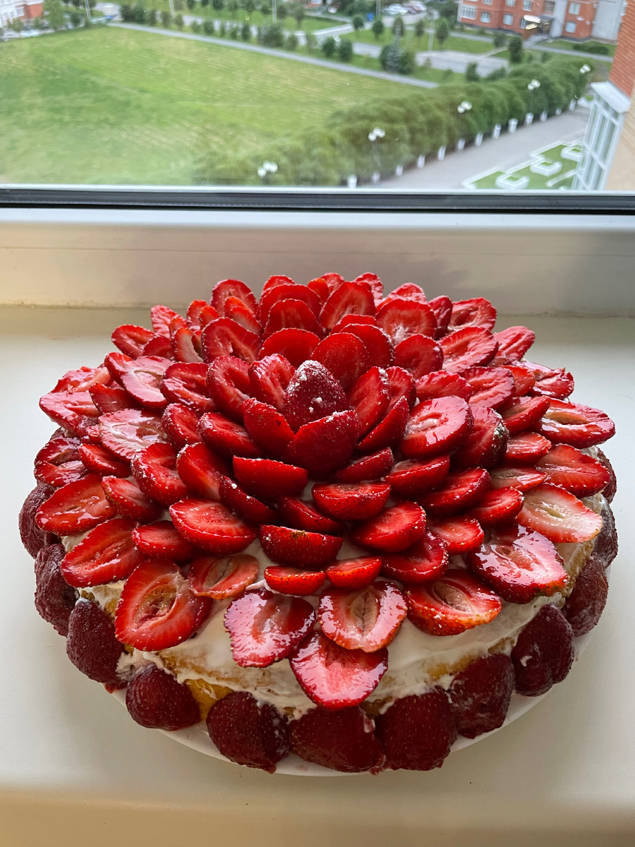 Пока клубничный сезон в разгаре, рекомендую приготовить очень вкусный клубничный торт, от которого вы точно будете в восторге. Мы с дочкой готовили его сегодня. Клубнику купили на рынке, хоть на даче есть своя, туда мы сегодня не ездили. Кстати, у нас клубнику продают по 200-250 рублей за килограмм. 6 яиц, 1 стакан сахара, 1 стакан муки, 1 ст. ложка разрыхлителя 250 г сливок 33%, 250 г маскарпоне, 100-150 г сахарной пудры Готовим бисквитное тесто, для этого хорошо взбиваем яйца с сахаром Добавляем понемногу муку с разрыхлителем, осторожно перемешиваем. Выливаем смесь в форму, на дно которой можно положить вырезанную по форме бумагу для выпечки Выпекаем в духовке при температуре 180 градусов минут 25-30. Оставляем бисквит остывать. Затем аккуратно выщипываем бисквит начиная с середины, оставляем края и дно. Для крема взбиваем сливки с маскарпоне и сахарной пудрой. Смазываем дно коржа кремом, выкладываем половинки клубники, на него всыпаем крошки бисквита, уплотняем ложкой,