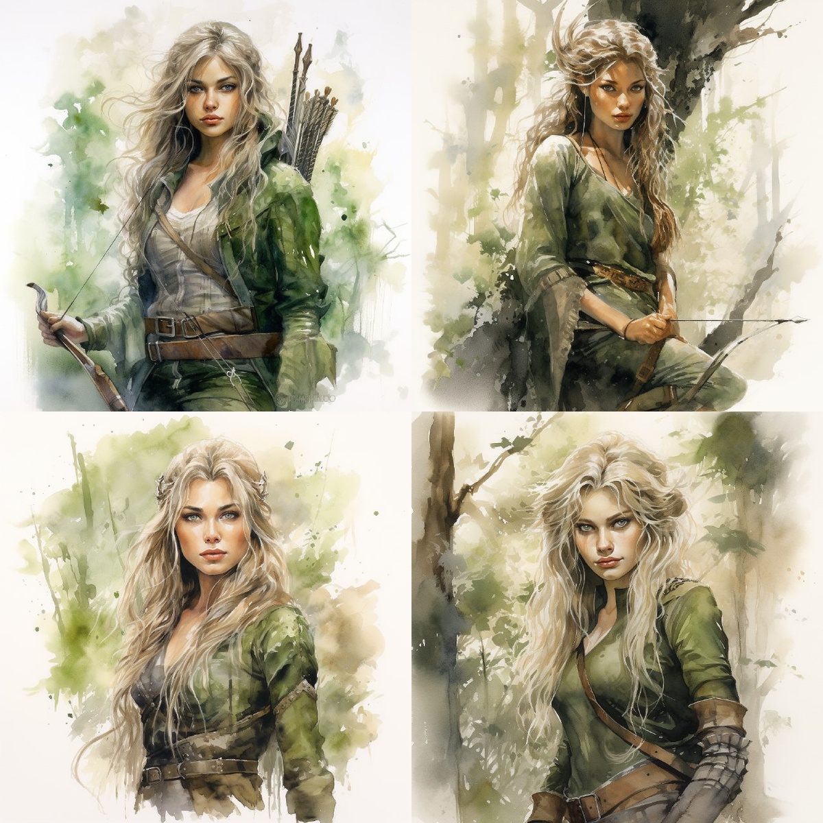 Watercolor illustration, Luis Royo style, of a beautiful elf archer, similar to Sonya Smith, dressed in olive green pants and an olive green blouse. In the middle of a forest.