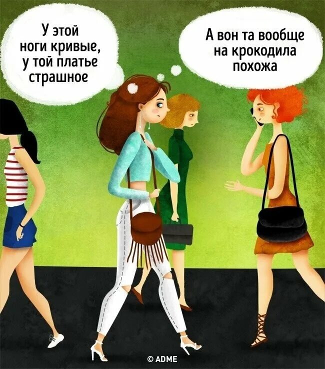 Видела девушку, идущую на встречу и анализировала: "Красивые ноги, аккуратные плечи, есть талия, но на боках немного вижу откладывается жирок. Если его убрать - будет идеальная фигура". Или так: "Этой женщине бы очень пошли длинные волосы, но она стрижется под горшок, жаль". "У этой девушки ладная фигурка, не к чему придраться, а у этой - неплохие данные, но увы, она себя забросила. Печально, а могла бы быть красоткой! Этот мужичок симпатичный, но лысенький. У этого походка медвежья, этот похож на ходячий бочонок с пивом".