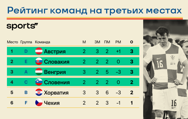 Что должно совпасть. По таблице третьих мест можно подумать, что Хорватия уже вылетела. Но нет! У Хорватии еще есть шанс. Правда, сильно мешает разница в -3 мяча. Коротко: какой формат и критерии? Четыре лучшие команды, занявшие третьи места, выйдут в плей-офф. Сначала смотрят на количество очков, при их равенстве идут по следующим показателям: ● разница мячей; ● забитые мячи; ● победы; ● наименьшее количество очков фэйр-плей (1 очко за желтую карточку, 3 очка за красную карточку); ● позиция команды в общем рейтинге отборочного турнира. У Хорватии еще есть математические шансы! Да, сейчас хорваты идут пятыми в таблице команд с третьих мест. Но существует расклад, при котором Хорватия поднимется в четверку. Нужно, чтобы сложилось очень многое: четыре результата. По пунктам. 1. Победа Дании над Сербией (чтобы у сербов осталось одно очко) или победа Сербии над Данией 3:0 (чтобы у датчан при двух очках была разница -3 при меньшем количестве забитых, у них два в двух играх); 2. Победа Англи