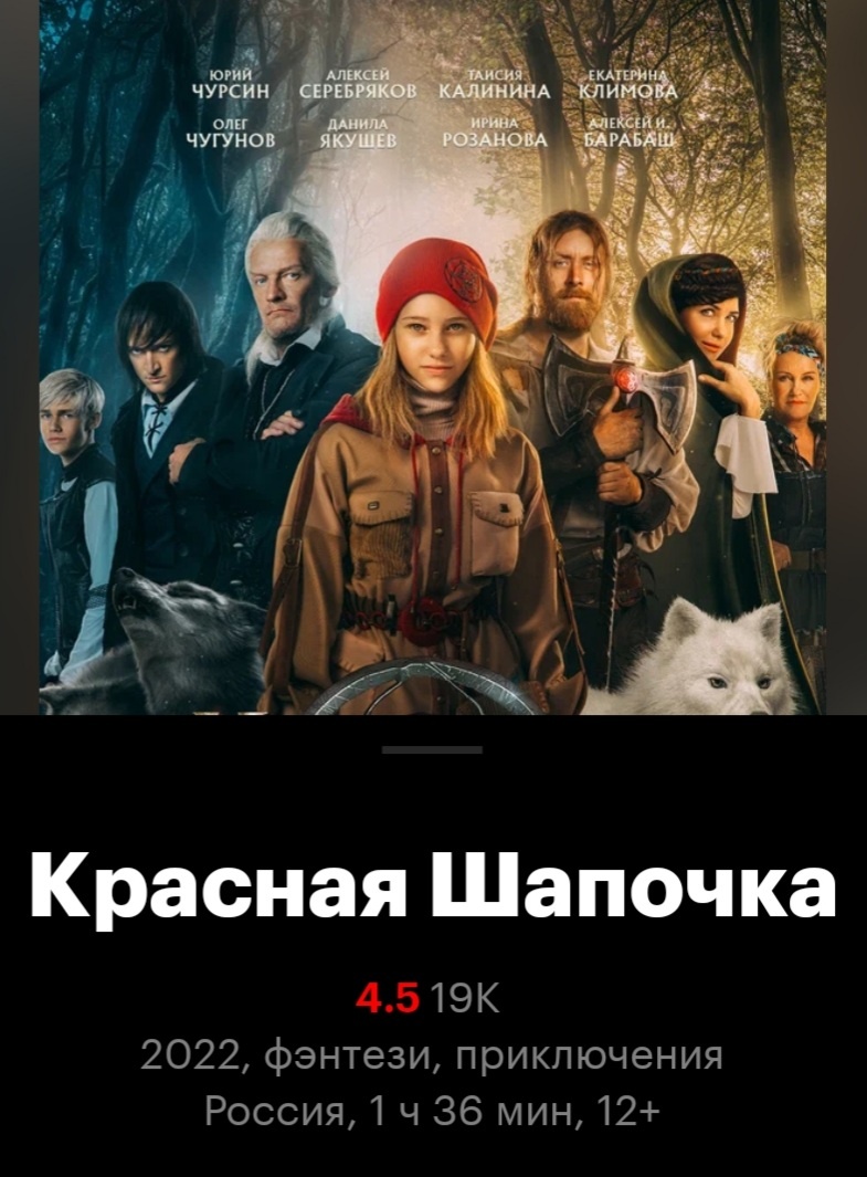 Искала я, значит, в интернете детский фильм "Про Красную Шапочку..." С Поплавской, разумеется. С целью приобщения мелких к детской классике. А интернет выкинул коленца, а заодно и меня. На Кинопоиск. На семейный, 12+, фильм "Красная шапочка" 2022 года.
