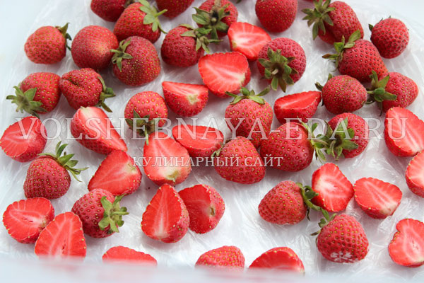 В некоторых рецептах могут потребоваться не целые ягодки, а нарезанные на аккуратные половинки (торт с клубничным желе и прочие десерты). В размороженном виде ягоду разрезать пополам, сохранив ее форму, невозможно. Поэтому отдельно стоит заморозить часть клубники половинками.