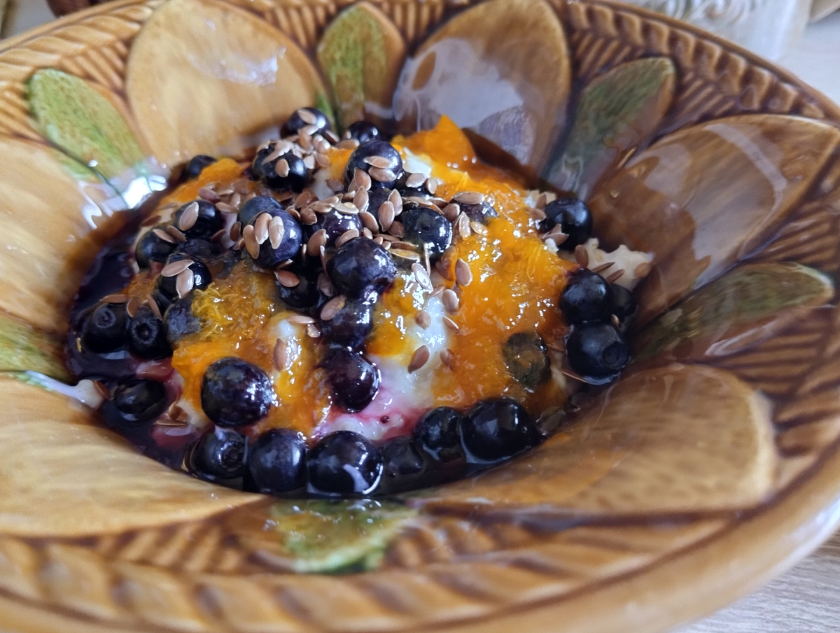 Вчера разморозить успела с утра морозилку, много ягод еше у меня там. Поэтому на завтрак к каше была черника. Также посыпала овсянку семенами льна и украсила остатками абрикосового варенья, которое варила ещё в мае из подаренных благодарным пациентами ягод. Варенье получилось густое и вкусное, как джем.