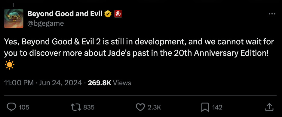 На прошлой неделе Ubisoft официально анонсировала ремастер оригинальной Beyond Good and Evil и подчеркнула его связь с долгожданным продолжением. Теперь издатель в очередной раз подтвердил существование предположения — Beyond Good and Evil 2 все еще находится в разработке. Отвечая на вопросы о ремастере в X, Ubisoft сказала: Да, Beyond Good & Evil 2 все еще в разработке. И мы с нетерпением ждем возможности рассказать вам больше о прошлом Джейд в издании к 20-летию! Насколько можно судить, это первое официальное обращение Ubisoft к фанатам по поводу Beyond Good and Evil 2 с июля 2020 года. Тогда разработчики сообщили, что "геймплейные кадры, стримы Space Monkey Report и наше присутствие на мероприятиях, будут крайне ограничены в ближайшее время". Это обещание разработчики, несомненно, сдержали. С тех пор единственные упоминания Ubisoft о Beyond Good and Evil 2 были в финансовых отчетах, и даже эти упоминания становились все реже. Утечки предполагали, что разработка игры продолжается, хо