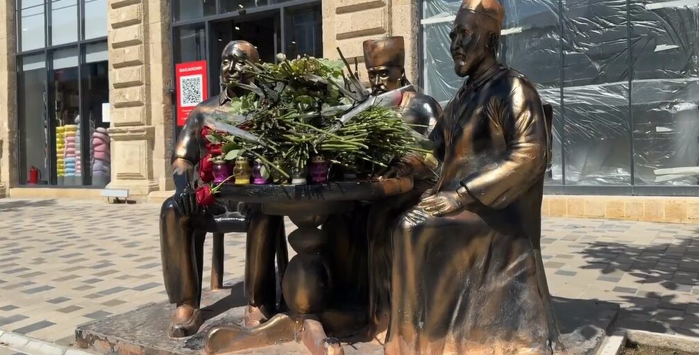 Жители Дербента несут цветы к памятнику трех религий, который символизирует единство разных конфессий