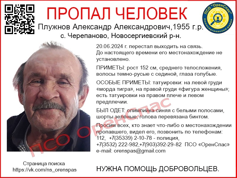 В Оренбургской области сотрудники полиции и «ОренСпаса» устанавливают местонахождение Александра Плужнова 1955 года рождения. Житель села Черепаново Новосергиевского района 20 июня 2024 года перестал выходить на связь с родными. До настоящего времени местонахождение мужчины не установлено. Приметы: рост 152 см, среднего телосложения, волосы темно-русые с сединой, глаза голубые. Особые приметы: голова перевязана бинтом. Есть татуировки: на левой груди «морда тигра», на правой груди «фигура женщины»; есть татуировки на правом плече и левом предплечье. Был одет: олимпийка синяя с белыми полосами, шорты зелёные, Всех, кто что-либо знает о местонахождении пропавшего или видел его, просят позвонить по телефонам: 112, +7(35339) 2-10-78 — полиция, +7(3532) 222-982,+7(903)392-29-82 ПСО «ОренСпас»,
