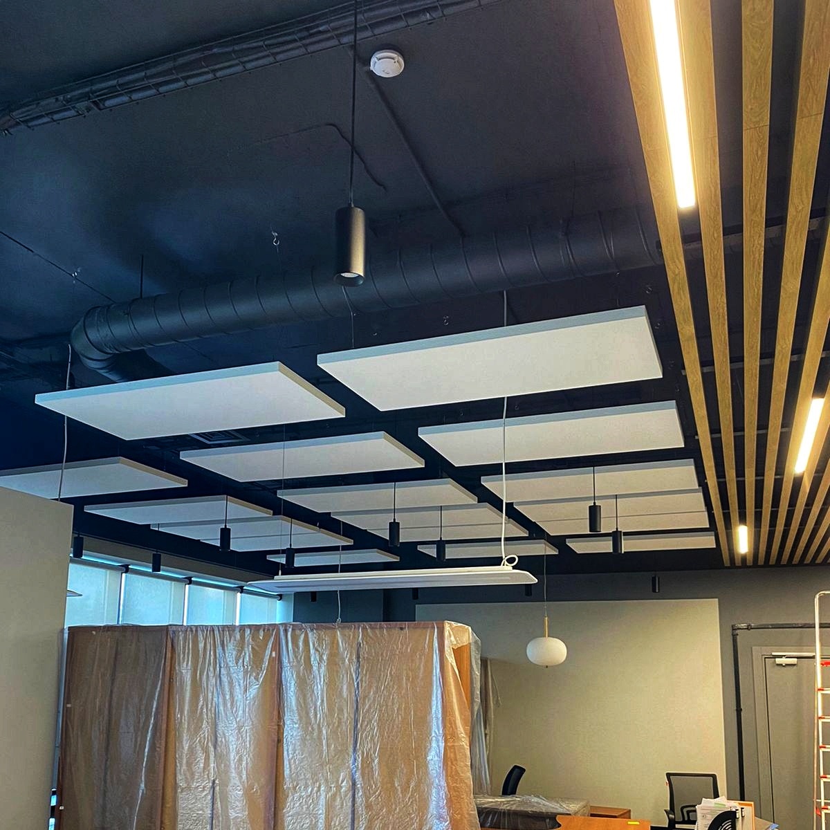 Офис в котором приятно находиться - это не только визуал, мебель и освещение, а также хорошая акустика. При чем последний критерий крупные и успешные компании ставят на первое место. Каким бы ни было комфортное и красивое помещение, если в нем неудобно разговаривать (приходится постоянно повышать голос и бороться с диссонасом между голосом и мыслью) - хочется убежать из него как можно быстрее. О продуктивной работе можно забыть. Виной всему - эхо. Постоянное отражение звуков от твердых поверхностей смешивает их и начинаается хаос. Говорим одно - слышим другое, теряем уверенность, напрягаем связки и тд. Именно с такой проблемой к нам обратилось руководство одной приборостороительной компании. Поставлена задача - сделать помещение менее гулким и как приятный бонус - сделать коммуникации на потолоке не такими заметными. Решали мы эту задачу с помощью акустических баффлов белого цвета и прямоугольной формы. Произвели монтаж на специальный крепеж, который позволяет установить бафф