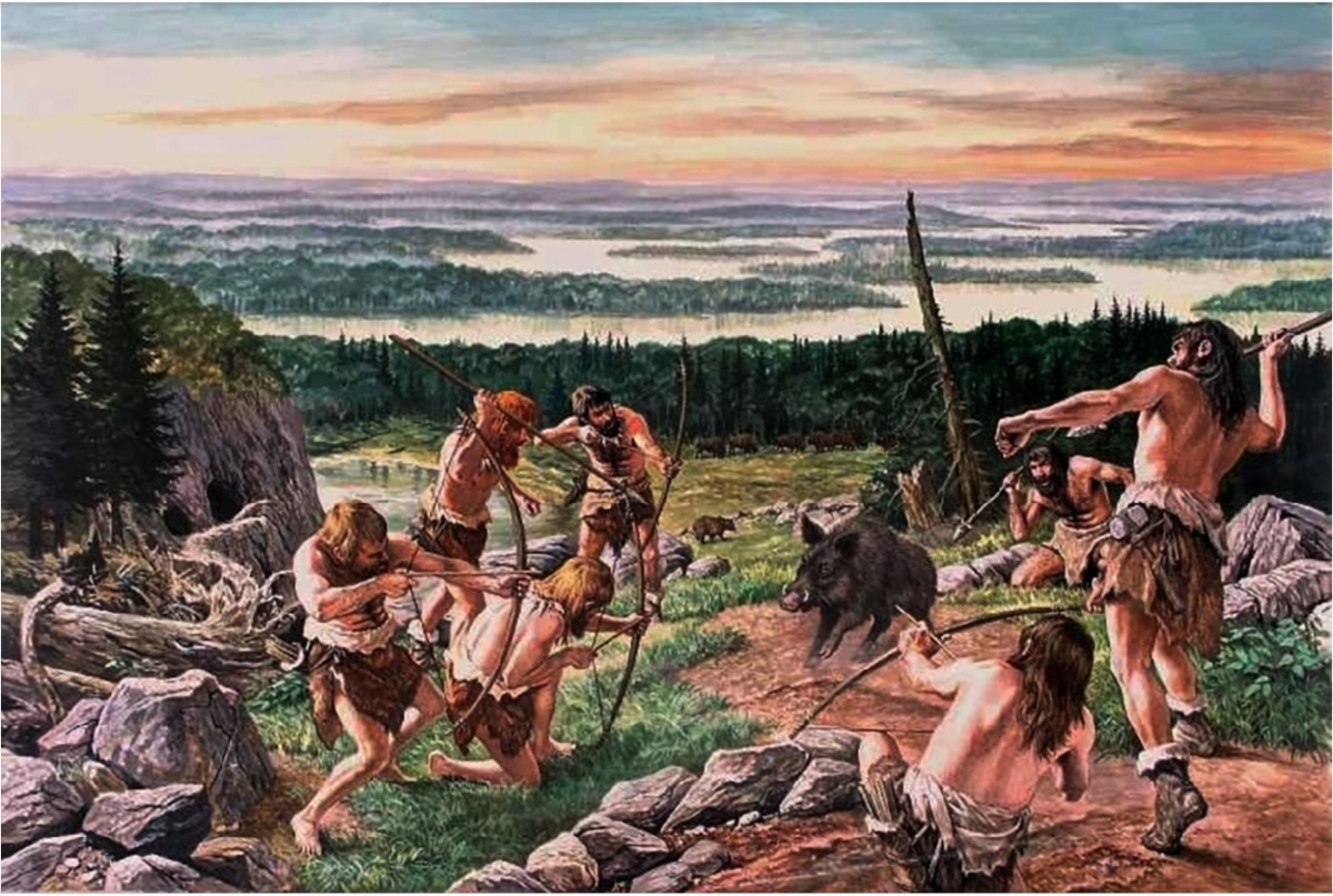 Особенность занятий людей каменного века состояла в том, что они брали от природы все в готовом виде. Такое хозяйство называют присваивающим. После отступления последнего ледника началось потепление. Бывшая ледяная пустыня покрылась реками и озерами, лесами, населенными дикими животными. Древние люди постепенно стали заниматься индивидуальной охотой. В этом им помогала собака — первое прирученное человеком животное. Люди переходили к оседлому образу жизни, изобрели лук и деревянные стрелы с кремневыми наконечниками, высверленные и шлифованные каменные топоры, каменную зернотерку, начали использовать при рыбной ловле выдолбленные из дерева челны (лодки). Зародились гончарство и ткачество. Люди стали изготавливать остродонную глиняную посуду, которую втыкали в земляной пол или в центр костра, поскольку в то время еще не знали, что такое стол.