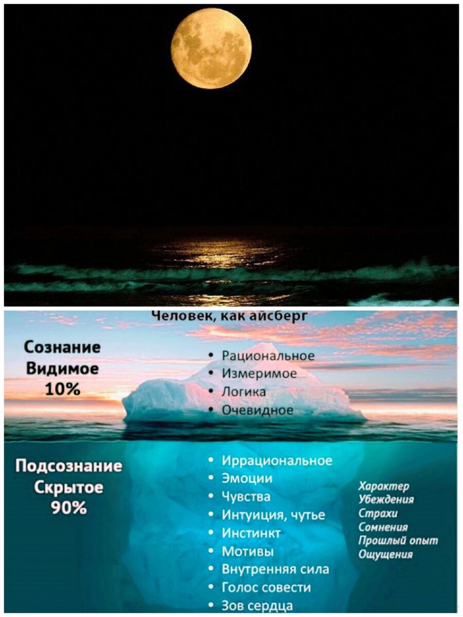 Друзья, хочу пояснить, почему тема очистки подсознания является одной из самых важных. Дело в том, что именно подсознание выстраивает нашу реальность. Нами управляет бессознательная часть, а в ней скрыто 90% и лишь 10% того, что мы осознаём. Подсознанием человека управляет Луна.