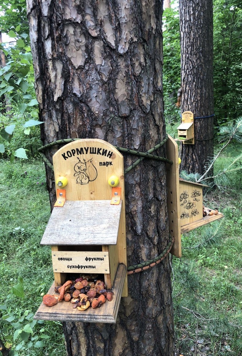 Этот посёлок, расположенный на Казанском направлении железной дороги, популярен благодаря большому пруду с удивительными соснами, на берегу которого расположены детская железная дорога и верёвочный парк. И именно активисты верёвочного парка "Небесная тропа" решили создать здесь ещё один парк - "Кормушкин". На деревьях закрепили специальные "столовые" для белочек. Их конструкция предполагает то, что внутрь забраться могут только белки.