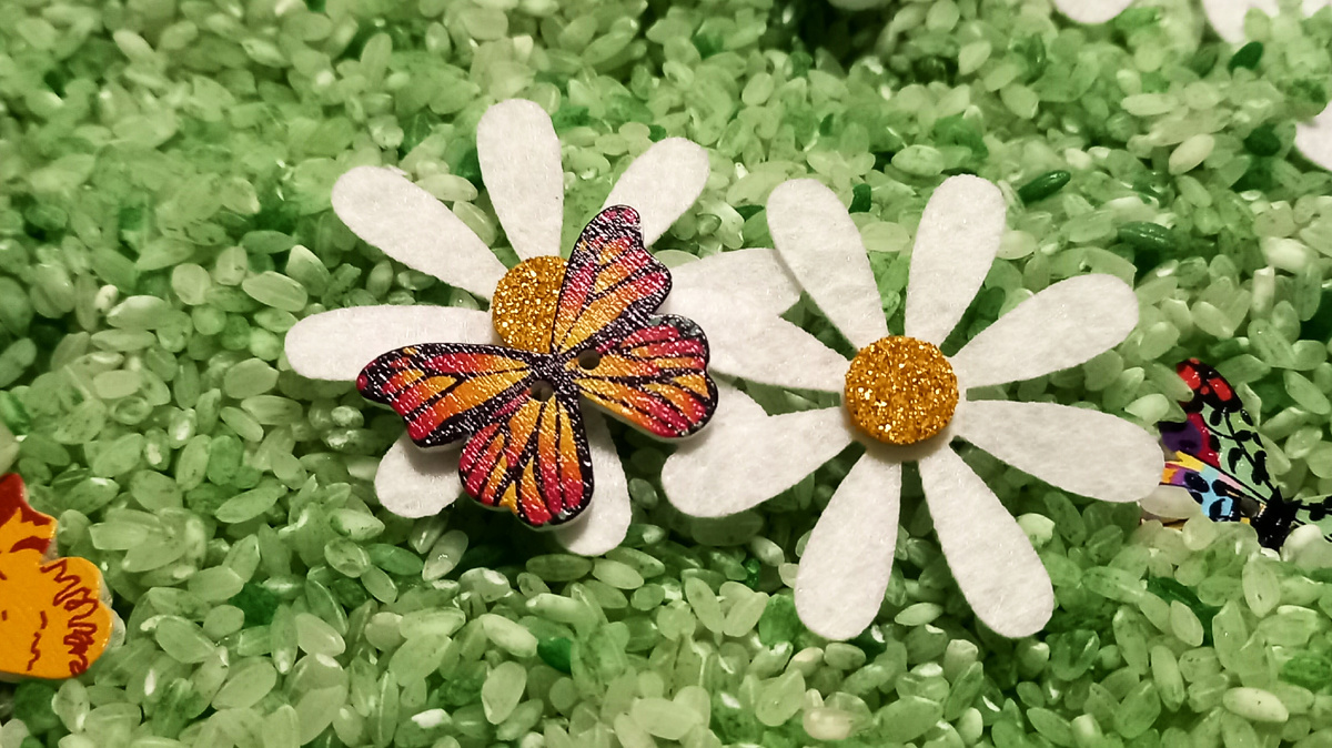 2. Теперь рис надо очистить для дальнейших игр. Займёмся сортировкой. Для самых маленьких уже прогрессом будет просто вытащить бабочек и цветы, без риса. Мы с Трофимкой цветочки убрали в пластиковую вазочку, а бабочек разложили в форму для льда - каждую бабочку в свой квадратик.