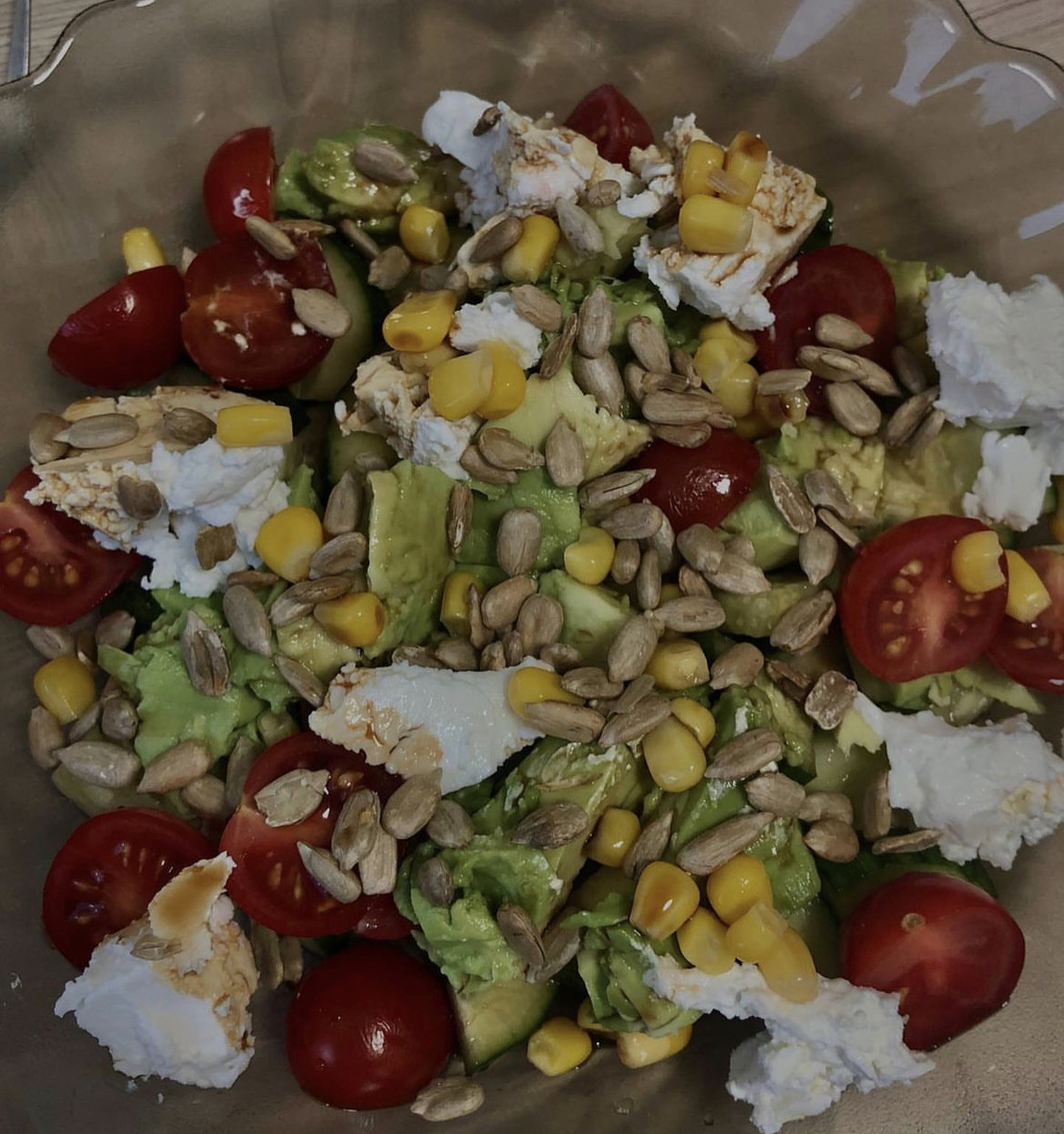 Понадобится: ✔️Спелый и мягкий авокадо ✔️Помидорки черри ✔️Свежий огурец ✔️Сыр фета или брынза ✔️Консервированная кукуруза ✔️Жареные семечки Нарезаем авокадо, огурец, черри и фету на кубики любого размера, выкладываем на тарелку. Важно не перемешивать ингредиенты, иначе испортится консистенция. Засыпаем консервированную кукурузу, посыпаем семечками. Заправляем подсолнечным маслом и немного добавляем соевый соус. Наслаждаемся👌🏻