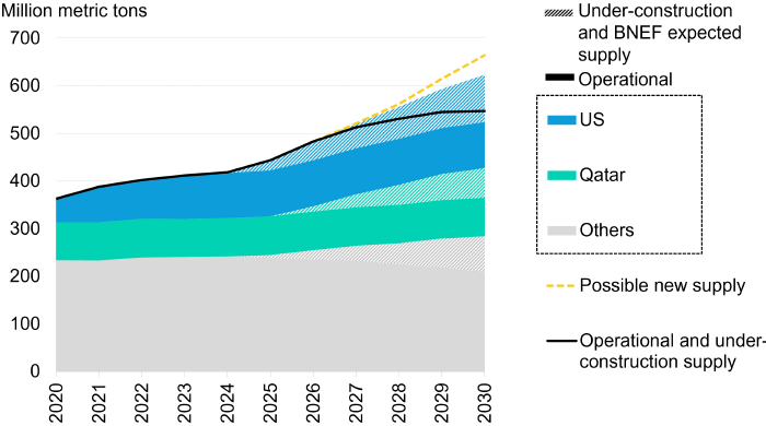 Объем мирового производства СПГ достигнет к 2030 году 547 млн метрических тонн, предполагает базовый прогноз BloombergNEF. Ожидается, что 42% от прироста придется на долю США, немногим меньше — на катарское месторождение North Field. Мировое производство СПГ по странам в млн метрических тонн в год: голубым — США, салатовым — Катар, серым — другие производители. Желтый пунктир — сценарий BloombergNEF, при котором заработают все СПГ-проекты, за которыми следит компания, черная линия — базовый прогноз. Источник: Bloomberg Объем мирового производства сжиженного природного газа достигнет к 2030 году 547 млн метрических тонн, прогнозирует BloombergNEF на основе данных по мощности как уже существующих, так и находящихся в стадии строительства СПГ-проектов (базовый прогноз). Это значение может оказаться еще выше и достичь 623 млн тонн, если заработают вообще все СПГ-проекты, за которыми следит BloombergNEF. 42% от прироста придется на долю США, немногим меньше — на катарское месторождение Nort