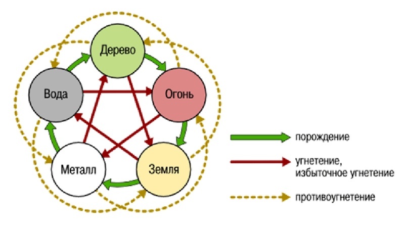 Вот как выглядит круг порождения и контроля 5 элементов БА ЦЗЫ Круг- УСИ Одним из основных и базовых понятий в китайской астрологии, является концепция пяти первоэлементов, стихий, движений У-СИН Вода, Дерево, Огонь, Земля, Металл. Они не просто существуют, они, находясь в постоянном движении, порождают и контролируют друг друга по определенным схемам. Эта концепция буквально пронизывает мироощущение китайцев с самого детства, многие традиции, медицина, культура построены на ней. Стрелки, которые идут по кругу – это цикл порождения. Вода питает Дерево, Дерево порождает Огонь, Огонь превращает все в Землю, в Земле зарождается Металл, Металл создает Воду. Стрелки, которые формируют пятиконечную звезду посередине, это цикл контроля и угнетения элементов. Так Огонь контролирует, если выражаться более образно, плавит Металл, Металл рубит Дерево, Дерево держит корнями, то есть контролирует Землю, Земля преграждает путь Воде, Вода тушит Огонь Это основные взаимодействия элементов на основе ко