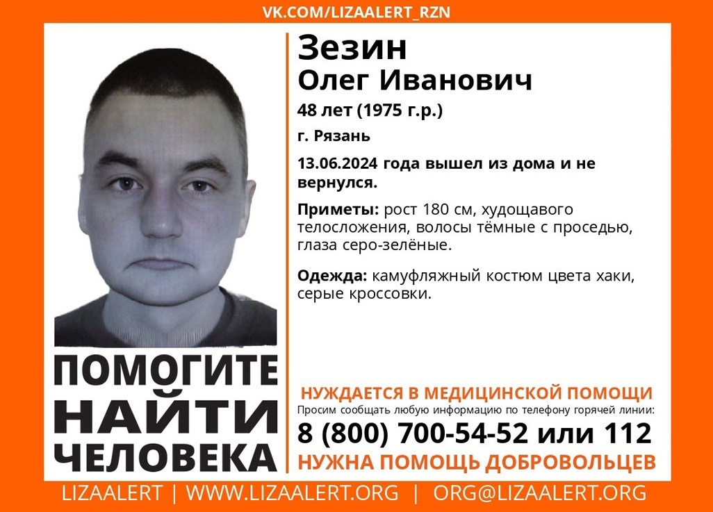 В Рязани пропал Олег Зенин 1975 года рождения, сообщают волонтеры ПСО «Лиза Алерт».