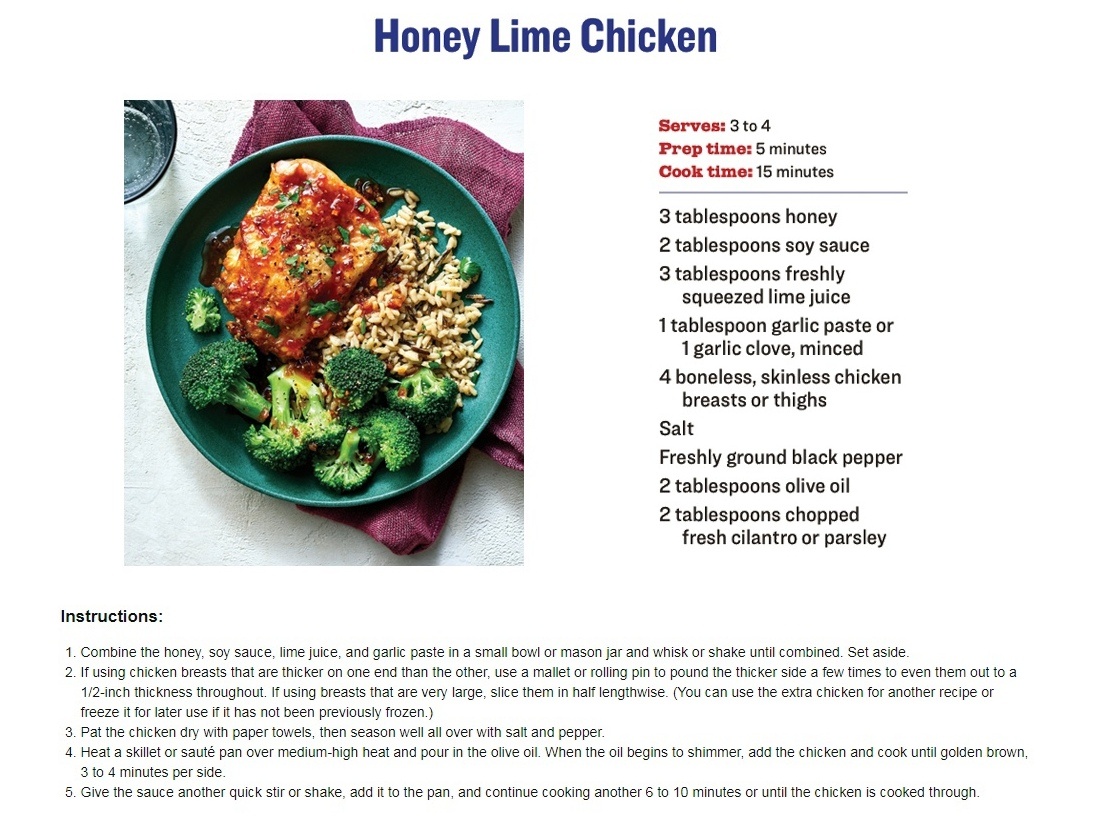 Привет, друзья! Уверена, что многие из Вас неравнодушны к курочке! Вот какой чудесный рецепт я сегодня нашла: Перевод рецепта: Количество порций: 3-4 Подготовка продуктов: 5 минут Время готовки блюда: 15 минут 3 столовые ложки меда 2 столовые ложки соевого соуса 3 столовые ложки свежевыжатого сока лайма 1 столовая ложка чесночной пасты или 1 измельченный зубчик чеснока 4 куриные грудки или бедра без костей и кожи Соль свежемолотый черный перец 2 столовые ложки оливкового масла столовые ложки измельченной свежей кинзы или петрушки Как готовить: 1. Смешайте мед, соевый соус, сок лайма и чесночную пасту в небольшой миске или стеклянной банке и взбейте до получения однородной массы. Отложите соус в сторону. 2. Если Вы используете куриные грудки неравномерной толщины, несколько раз отбейте молотком или скалкой более толстую сторону, чтобы разровнять их по всей длине до толщины ½ дюйма (около 1 см). Если Вы используете очень крупные грудки, разрежьте их вдоль пополам. (Вы можете исполь