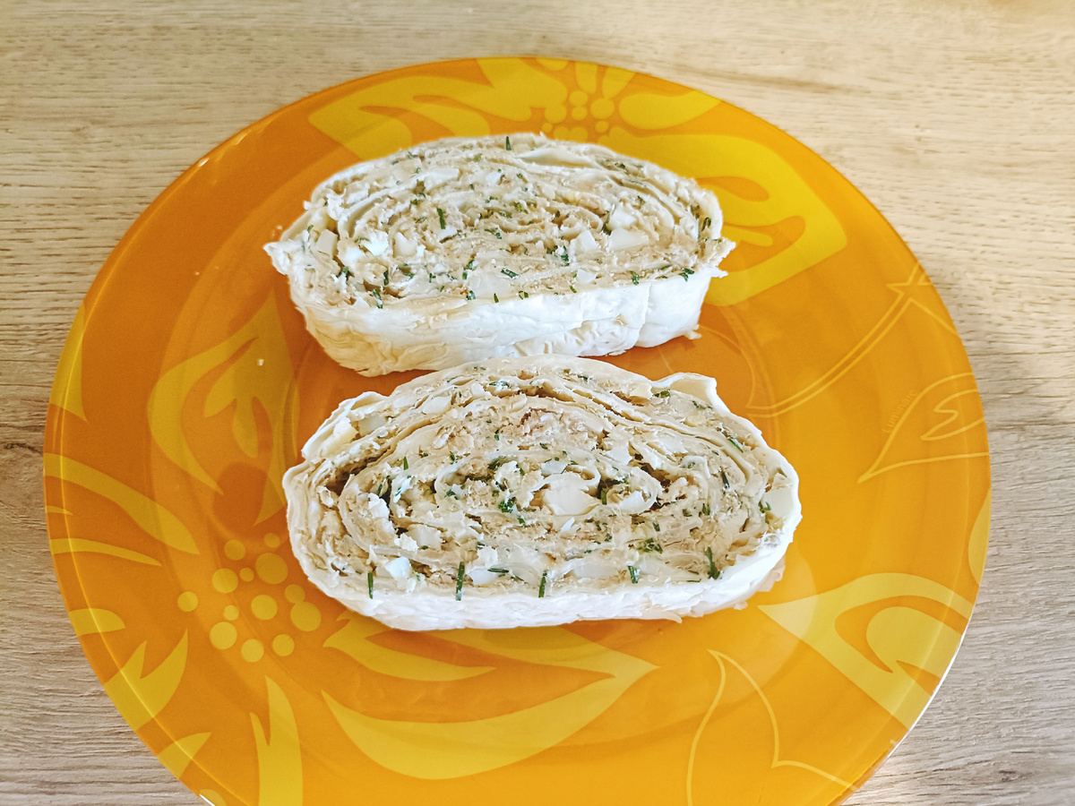 Вкусная, сытная и полезная закуска. Смело можно брать на заметку тем, кто придерживается правильного питания. Подойдёт как для праздничного стола , так и для перекуса или ужина. Вам понадобится: Лаваш армянский - 2 листа или 1 большой лист Тунец консервированный в собственном соку - 2 банки Яйца - 4 шт. Сыр - 100г Укроп - 1 большой пучок (можно вместо укропа взять петрушку) Сыр творожный - 2 упаковки Из тунца сливаем жидкость, разминаем вилкой. Яйца отвариваем вкрутую, остужаем, очищаем и мелкого рубим. Сыр натираем на средней тёрке. Укроп мелко рубим. Всё смешиваем, добавляем половину упаковки творожного сыра и ещё раз хорошо перемешиваем получившуюся начинку. Смазываем лаваш оставшимся творожным сыром. Выкладываем начинку на лаваш. Сворачиваем рулет и плотно заворачиваем его в фольгу. Даём настояться в холодильнике минимум 2 часа. Подаём холодным или чуть теплым. Приятного аппетита 🍲 Понравился рецепт? Ставьте лайк 👍и подписывайтесь на мой канал
