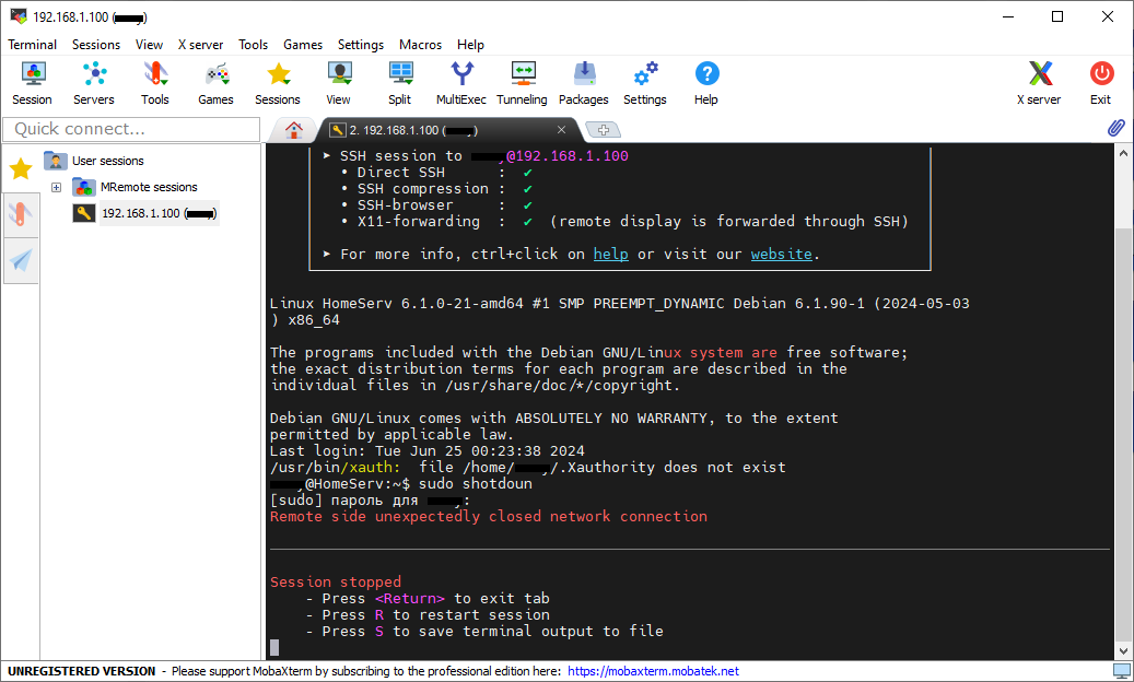 В статье Домашний медиа-сервер. Установка Debian рассказал про установку на сервер операционной системы. Теперь нужно отключить от сервера монитор и клавиатуру, закинуть его на шкаф и продолжать настройку. Для удаленного доступа к серверу будем использовать подключение по протоколу SSH. В качестве SSH-клиента будем использовать программу MobaXterm. Для доступа к файлам по протоколу SMB (в том числе с виндовых машин) установим Samba. sudo apt -y install samba Сделаем копию конфигурационного файла sudo cp /etc/samba/smb.conf{,backup} Самый простой конфигурационный файл может выглядеть так: [global]