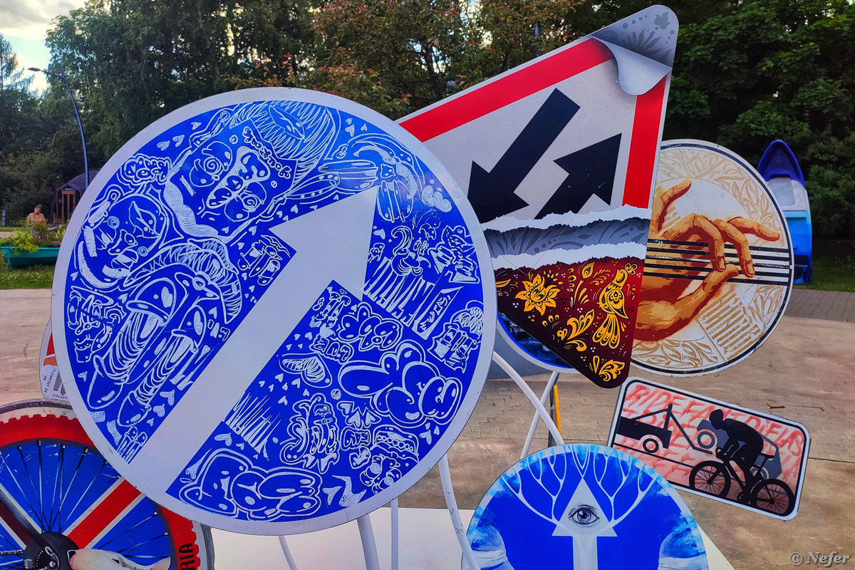 Знаки расположены в одном месте, недалеко от сцены на главной площади. Они не информируют участников дорожного движения, это арт-объект. Интересно порассматривать. Знак "Остановка запрещена" превратился в колесо велосипеда, рядом с которым задорно бежит бультерьер Знак "Въезд запрещен", знаменитый "Кирпич". Именно этот знак вызывает наибольшее любопытство. Около него все зависают. Зашифровано 10 пословиц. Напишите, какие опознаете :) Дорожный знак "Тупик". В детстве для меня это был просто красный молоточек)) Дальше знаки "Дорожные работы", "Работает эвакуатор", "Конец всех ограничений", "Движение прямо" и знак "Ограничение максимальной скорости 20 км/ч", около которого все фотографируются :) В интернете пишут, что это выставка под названием "Помеха справа". Ее организовала команда уличных художников Desarte 365. А еще в парке "Кузьминки" есть лодки-скамейки. Поделитесь публикацией с друзьями в соцсетях! Добавьте мой канал в свою ленту, чтобы не пропустить новые публикации.