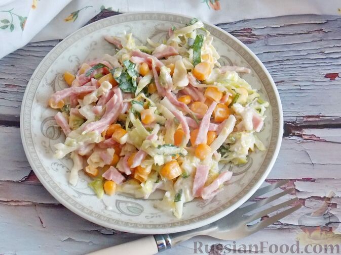 Салат из капусты с ветчиной и кукурузой. Салат с курицей, овощами и сыром. Винегрет со свежими огурцами и щавелем. Овощной салат с сосисками. Салат из редиса и сельдерея. Салат с курицей, болгарским перцем, огурцом и сыром. Отварное куриное мясо, свежие сочные овощи и твёрдый сыр соединяет заправка из майонеза и горчицы, которая придаёт салату лёгкую пикантность. Винегрет с молодыми овощами, свежими огурцами, щавелем и консервированной фасолью получается изумительным! За кислую нотку в салате отвечает щавель, он используется как альтернатива солёным огурцам или квашеной капусте. Свежие огурцы прекрасно подчёркивают вкус винегрета. Для заправки лучше всего взять ароматное нерафинированное подсолнечное масло. Сосиски можно использовать не только для приготовления солянки или хот-догов – можно сделать овощной салат с сосисками. Простое блюдо, которое быстро утолит голод. Сочные помидоры и сладкий перец отлично дополняют аппетитные кружочки сосисок. Салат из редиса и сельдерея, с орехами