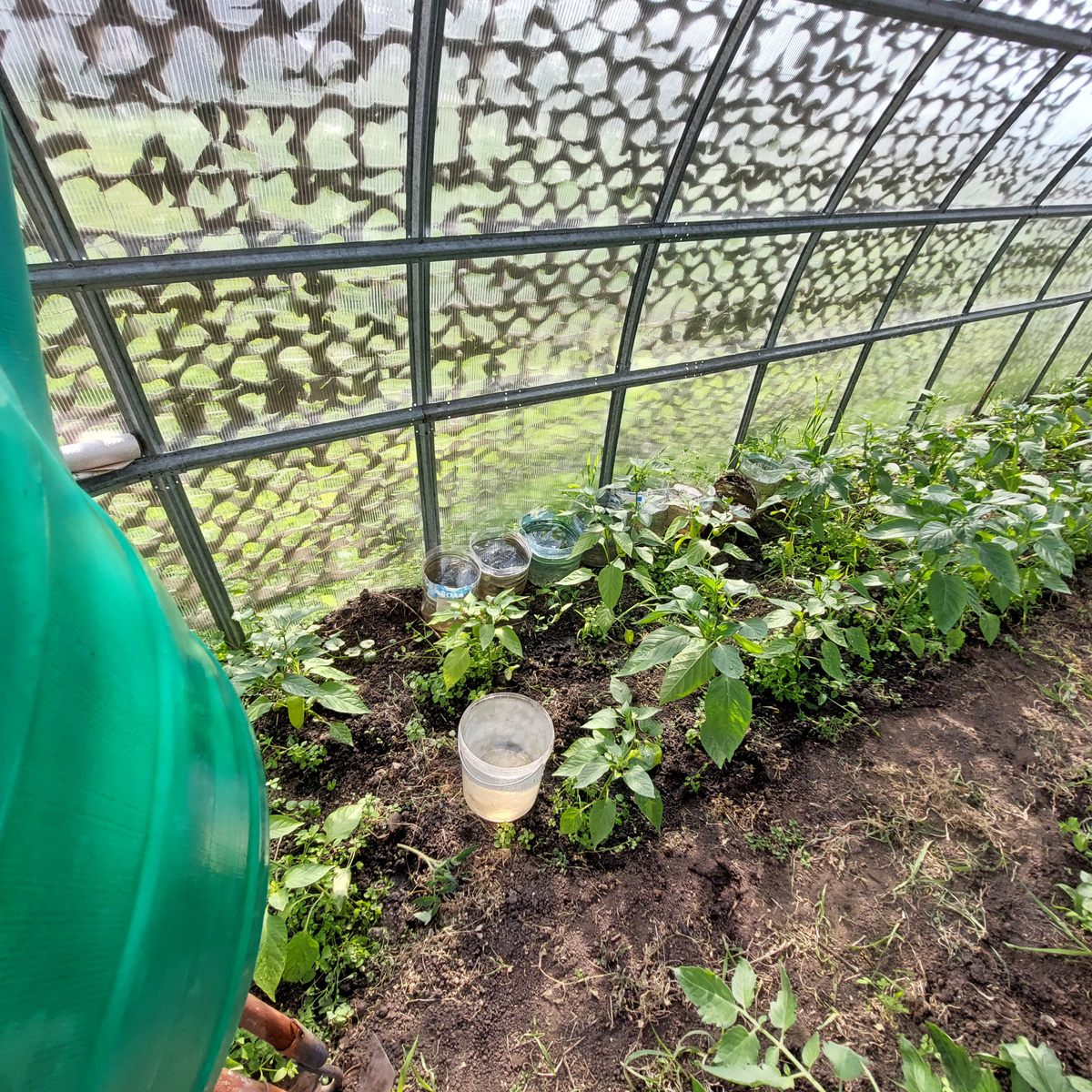 Кстати, обе двери у нас в теплице давно открыты настежь. Там же у нас стоят примерно по ее периметру ведерки с водой и бочка. Для увлажнения и создания более или менее нормального микроклимата, но без наворотов полива с ИИ. Иначе вообще будет слишком жарко для растений. А на ИИ у нас просто нет денег , да и самой такой задачи мы не ставили. ЗАЧЕМ!?