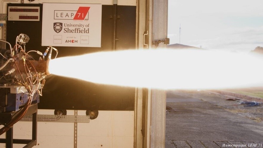 Дубайская компания LEAP 71 провела огневые испытания экспериментального 3D-печатного ракетного двигателя, полностью спроектированного искусственным интеллектом — инженерной вычислительной моделью Noyron — всего за две недели. Силовая установка с тягой в 5 кH прошла цикл огневых испытаний продолжительностью до двенадцати секунд. Подобные компактные двигатели обычно используются на верхних ступенях ракет-носителей — разгонных блоках. Опытный образец из хромо-циркониевого медного сплава изготовлен немецким бюро промышленной 3D-печати Additive Manufacturing Customized Machines (AMCM), дочерним предприятием производителя аддитивных систем по технологии лазерного синтеза на подложке Electro-Optical Systems (EOS). Постобработкой занимались специалисты Шеффилдского университета, испытания прошли на полигоне британской компании Airborne Engineering. Топливной парой служат керосин и жидкий кислород, а температуры в камере сгорания достигают трех тысяч градусов Цельсия, что требует активного охла