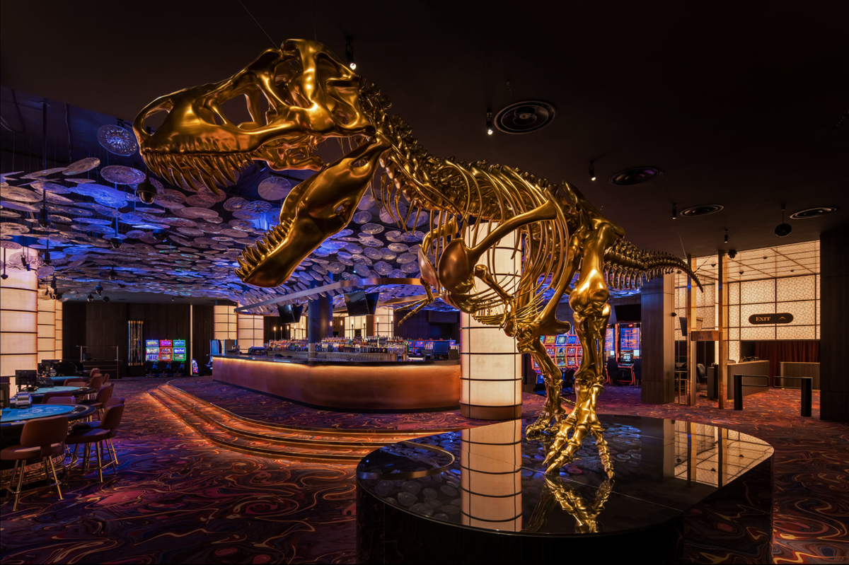 Обе фигуры напечатаны на 3D-принтере. Скульптура тираннозавра размером с настоящее создание — более 3 метров в высоту и 8 метров в длину. Что общего у доисторических ящериц и современных игроков? Их общая страсть — большая добыча. Дизайнеры из YOD Design Lab создали инсталляцию из стеклянных медуз на потолке в самом большом зале казино, как дань уважения приморскому городу Одессе. Множественные круглые прозрачные пластины образуют волну, которая освещается лучами света бирюзового цвета. Так они получили уникальный оттенок синего, которого нет нигде, кроме как в тихой бухте у самого б
