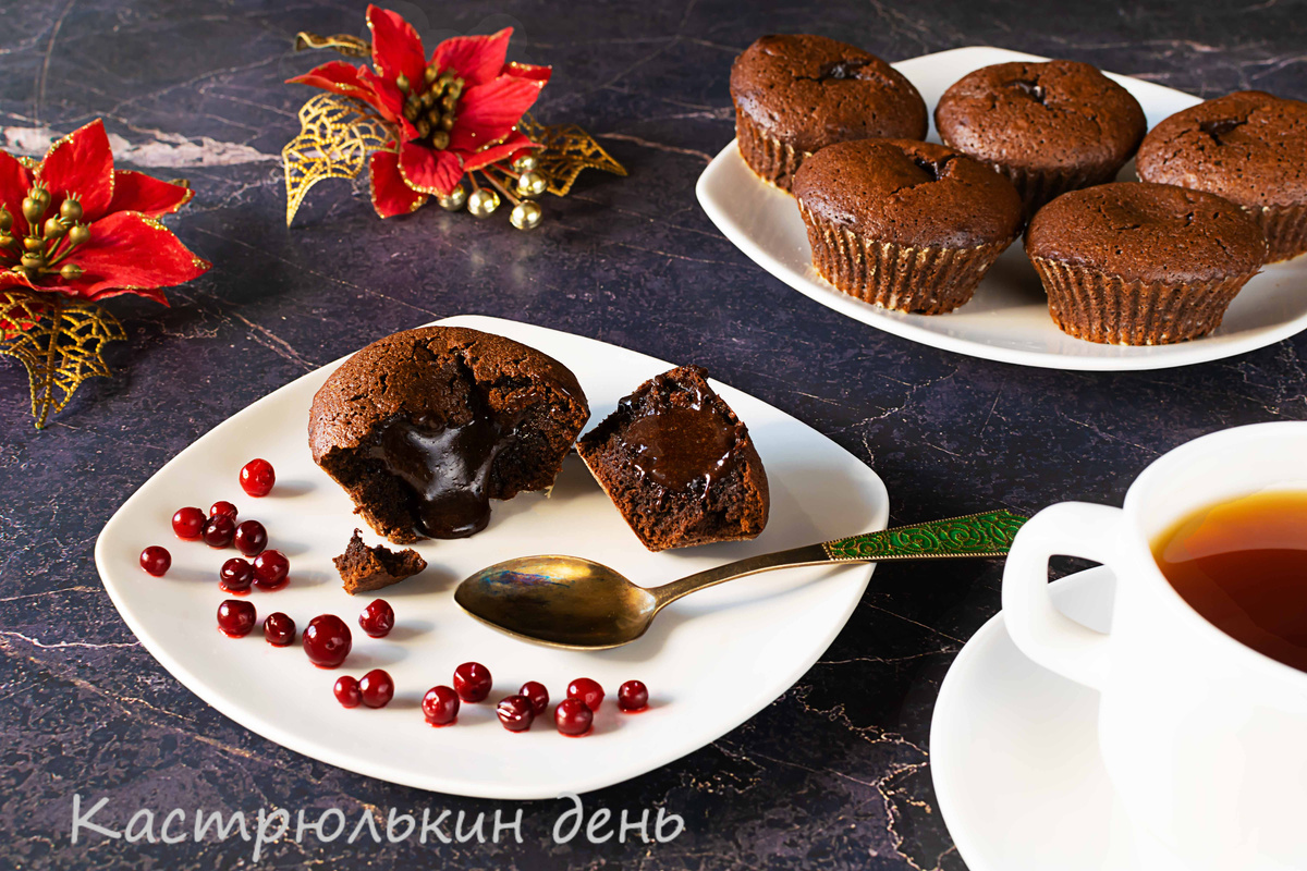 Шоколадные фонданы поставила в предварительно разогретую духовку. Выпекала при температуре 180 градусов 9 минут. При таком времени приготовления они получаются с жидким центром. При выпечке 12 минут сердцевина будет просто мягкой.