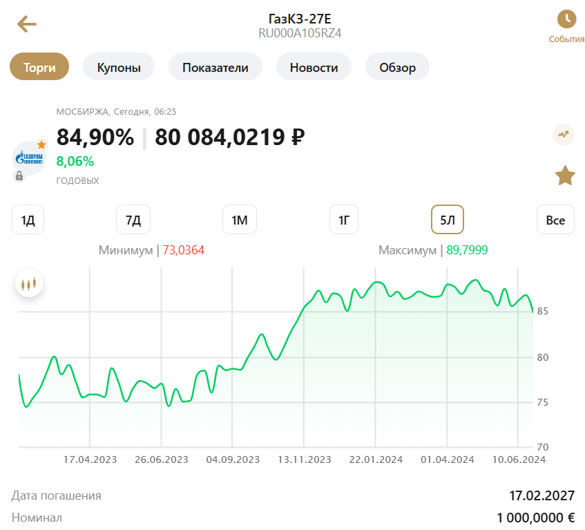 Замещающая облигация ГазКЗ-27Е: график рублевой цены до июня 2024 года