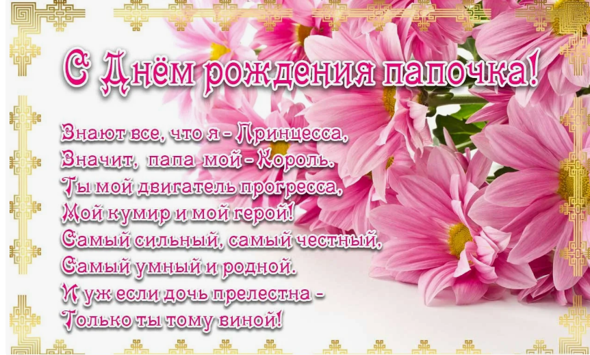 В особенный день, когда отмечает день рождения наш любимый папа, дни рождения - это не просто очередная веха на жизненном пути, а возможность отпраздновать исключительную связь, которую мы разделяем со своими отцами. Дочерям особенно повезло иметь такого удивительного человека, который направлял их путь, поддерживал их мечты и всегда был рядом, чтобы поделиться мудростью и любовью. Независимо от того, хотите ли вы выразить свою безграничную благодарность или просто поделиться своими теплыми пожеланиями, мы собрали трогательные поздравления с днем рождения в прозе, которые идеально подойдут для пап от их дочерей. Короткие: Трогательные: Прикольные: От маленькой дочки: От взрослой дочери: Красивые: Душевные: Длинные: