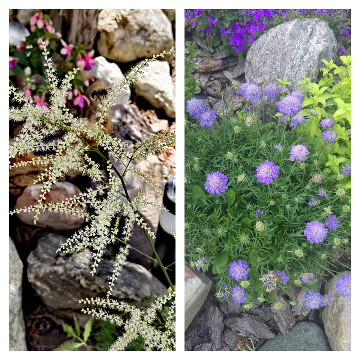 Бабочки, пчелы и другие насекомые-опылители увиваются над медовыми цветами, что добавляет красоты рокарию.