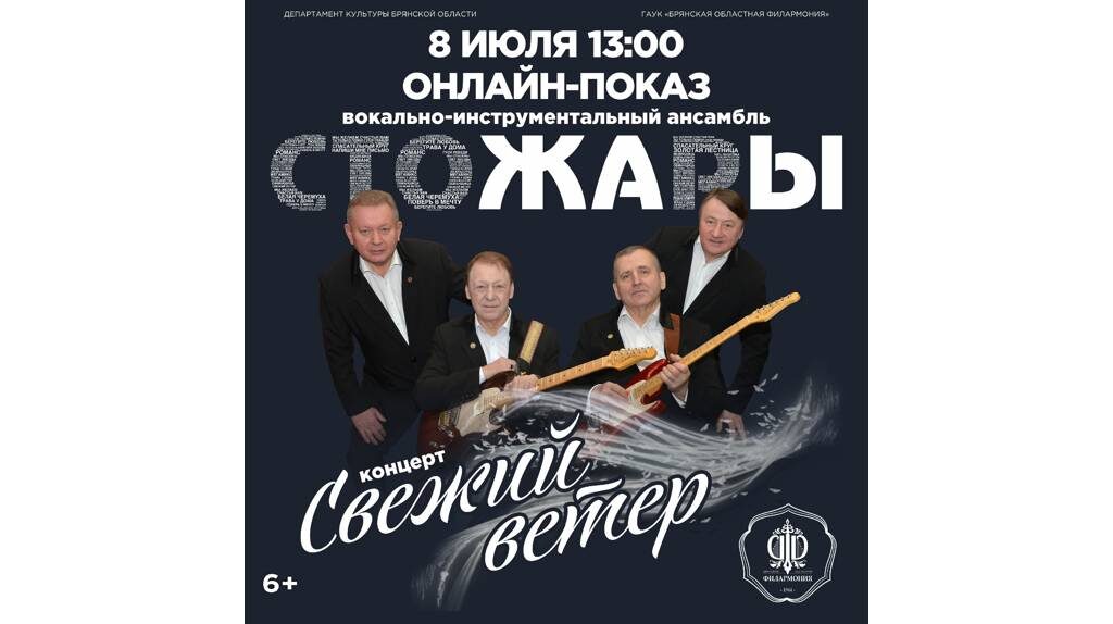 Брянская областная филармония предлагает вниманию онлайн-показ концертной программы концертной программы «Свежий ветер» легендарного ВИА «Стожары» (худ. руководитель А.А. Пономарёв). Онлайн-показ приурочен ко Дню семьи, любви и верности. В программе представлены как уже ставшие популярными композиции, так и новые песни, среди которых: «Золотая лестница», «Берегите любовь», «Спасательный круг», «100% позитива», «На соседней улице», «Эй, красотка», «Трава у дома», «Мы желаем счастья вам», «Свежий ветер», «Поверь в мечту», «Мечта сбывается», «Когда душа поёт»... Онлайн-показ состоится в понедельник, 8 июля. Начало в 13:00. Об этом сообщает Брянская областная филармония. 6+ ФОТО: Брянская областная филармония Брянцев приглашают на онлайн-показ концерта «Свежий ветер» ВИА «Стожары»