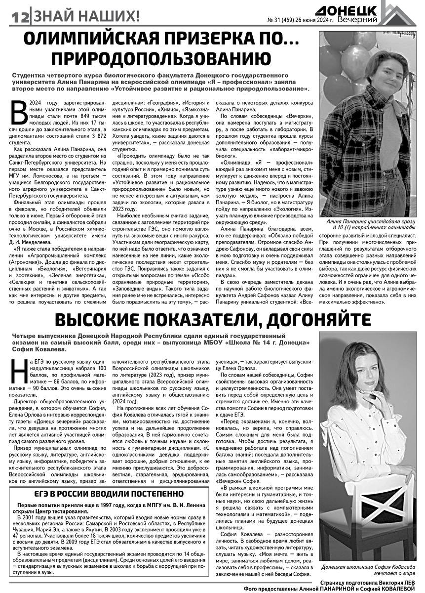 Серебряная медалистка Всероссийской олимпиады в интервью для газеты "Донецк вечерний". В новом выпуске газеты "Донецк вечерний" вышло интервью с победительницей самой престижной студенческой олимпиады в России «Я — профессионал» Алиной Панариной.